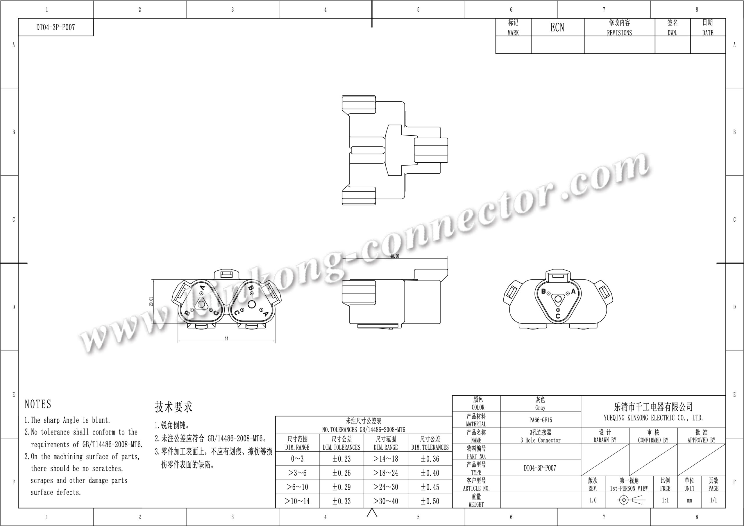 Kinkong Part Number | DT04-3P-P007 | Material | Housing:PBT+G,PA66+GF |